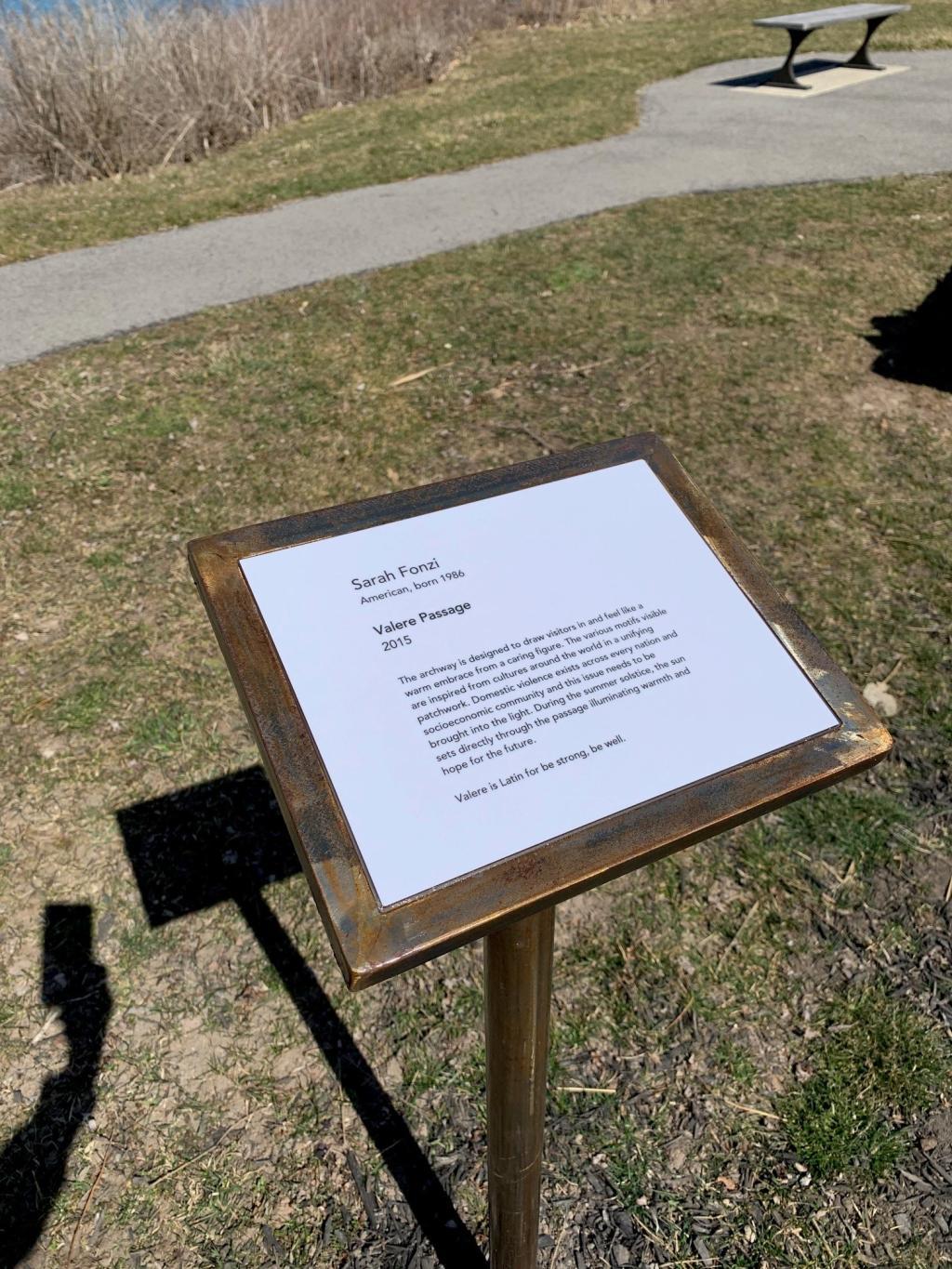The Tribute Garden was designed by landscape architect Joy Kuebler and includes two walls of bricks and stones honoring and memorializing loved ones, an earth-berm amphitheater, bench settings and plantings. An intricate metal-forged trellis designed by sculptor Sarah Fonzi adds a visual focal point to the peaceful setting.