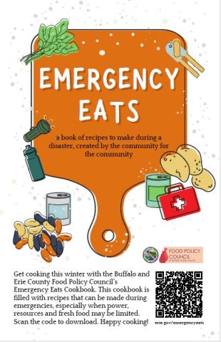 EMERGENCY EATS a book of recipes to make during a disaster, created by the community for the community  Get cooking this winter with the Buffalo and Erie County Food Policy Council's Emergency Eats Cookbook. This cookbook is filled with recipes that can be made during emergencies, especially when power, resources and fresh food may be limited. Scan the code to download. Happy cooking! https://www3.erie.gov/fpc/