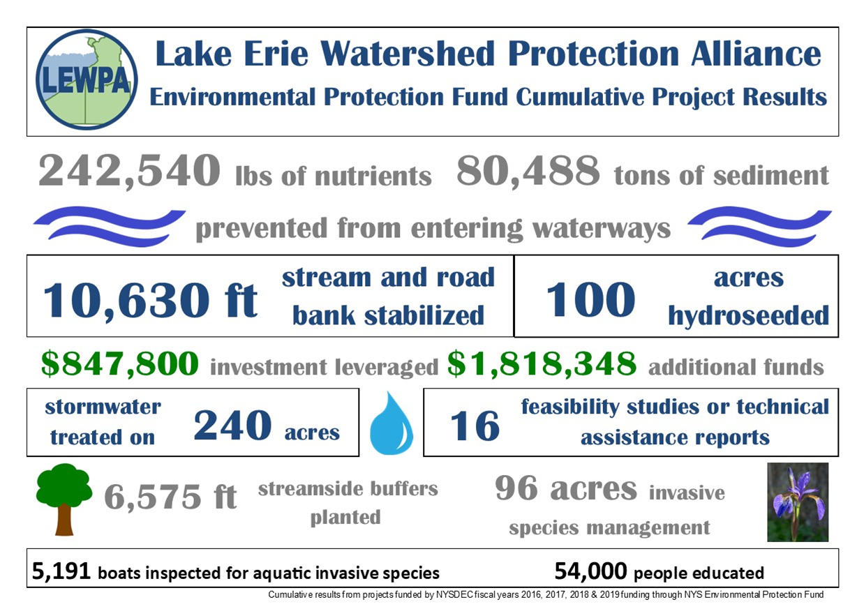 The Lake Erie Watershed Protection Alliance (LEWPA) was awarded funding from the New York State Department of Environmental Conservation (NYSDEC) through the Environmental Protection Fund (EPF) to implement water quality improvement and protection projects in the watershed.