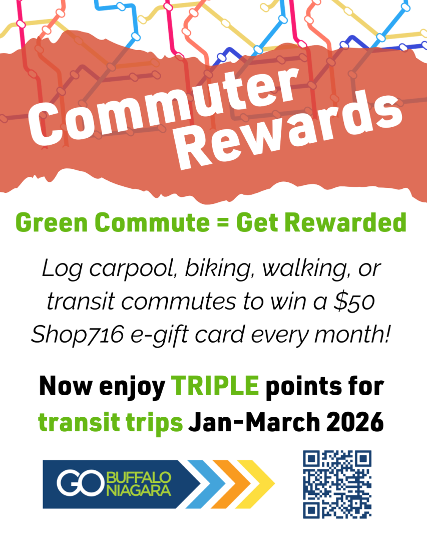 Commuters who log at least 10 trips using a sustainable mode of transportation in the Commutifi Commuter Portal each month will be entered to a $50 shop716 e-gift card that can be redeemed at over 850 local businesses. Limited Time Offer: TRIPLE transit points Jan-March 2026. Join Rewards Program HERE!