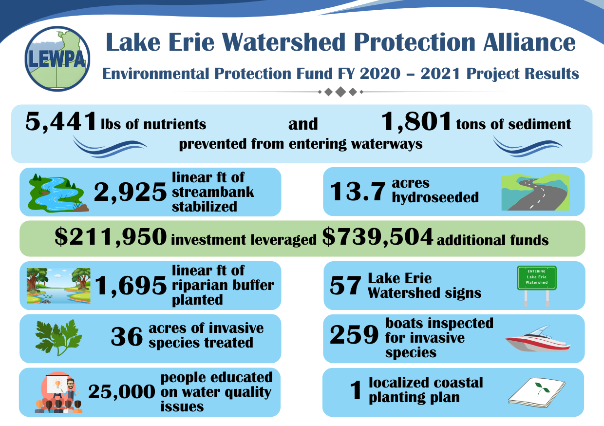LEWPA was awarded funding from the New York State Department of Environmental Conservation through the Environmental Protection Fund (EPF) to implement water quality improvement and protection projects in the watershed. Check out the latest annual report from 2024. Below is a graphic showing the results of projects recently completed in the first year under the second contract between NYSDEC and LEWPA.
