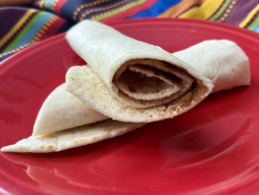 - Sprinkle sugar and cinnamon over entire tortilla.