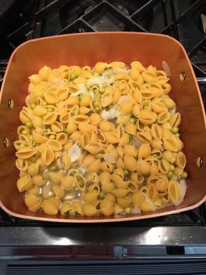 - Fill empty pea can with water and pour into pan. Water should fill to top of pasta. If it doesn't, add in additional water.