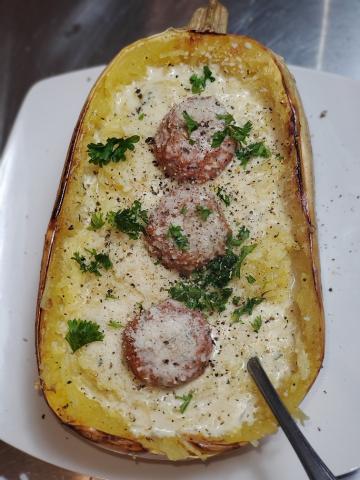 - Top the spaghetti squash with alfredo and plant-based meatballs of your choice.