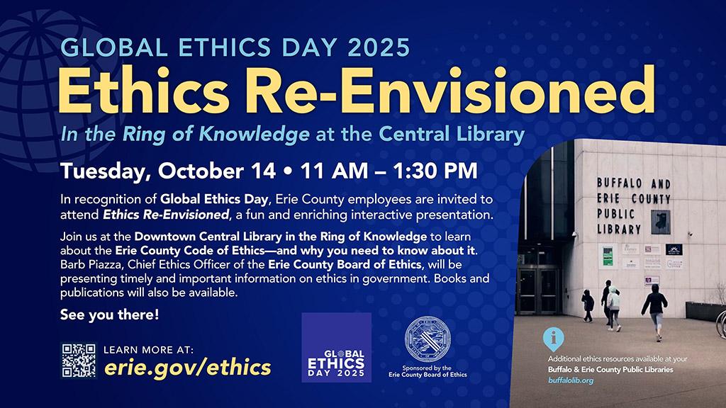 In recognition of Global Ethics Day, October 15, 2025, Erie County employees are invited to attend Ethics Re-Envisioned on Tuesday, October 14, 2025 at the Downtown Central Library, full details below.