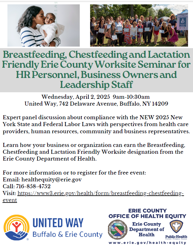 The Erie County Department of Health (ECDOH) aims to use inclusive language that acknowledges and supports diversity and inclusion in human milk feeding. Throughout this web page, the terms breastfeeding, chestfeeding and lactation are used to describe feeding human milk (from a donor or birth parent) to a child from a bottle, cup, spoon, syringe, breast, or the chest. While the Erie County Department of Health remains dedicated to inclusive language, some of the affiliated links may use less affirming language.