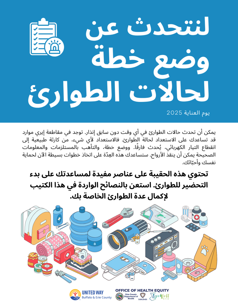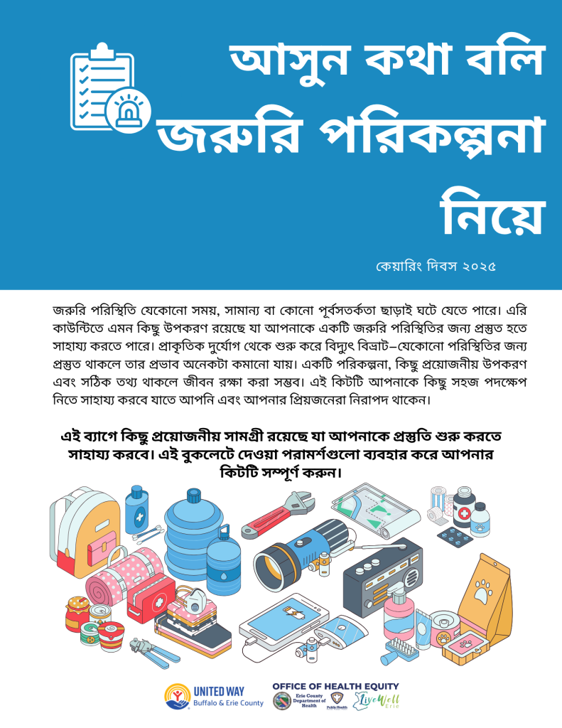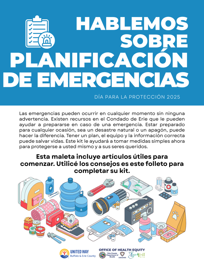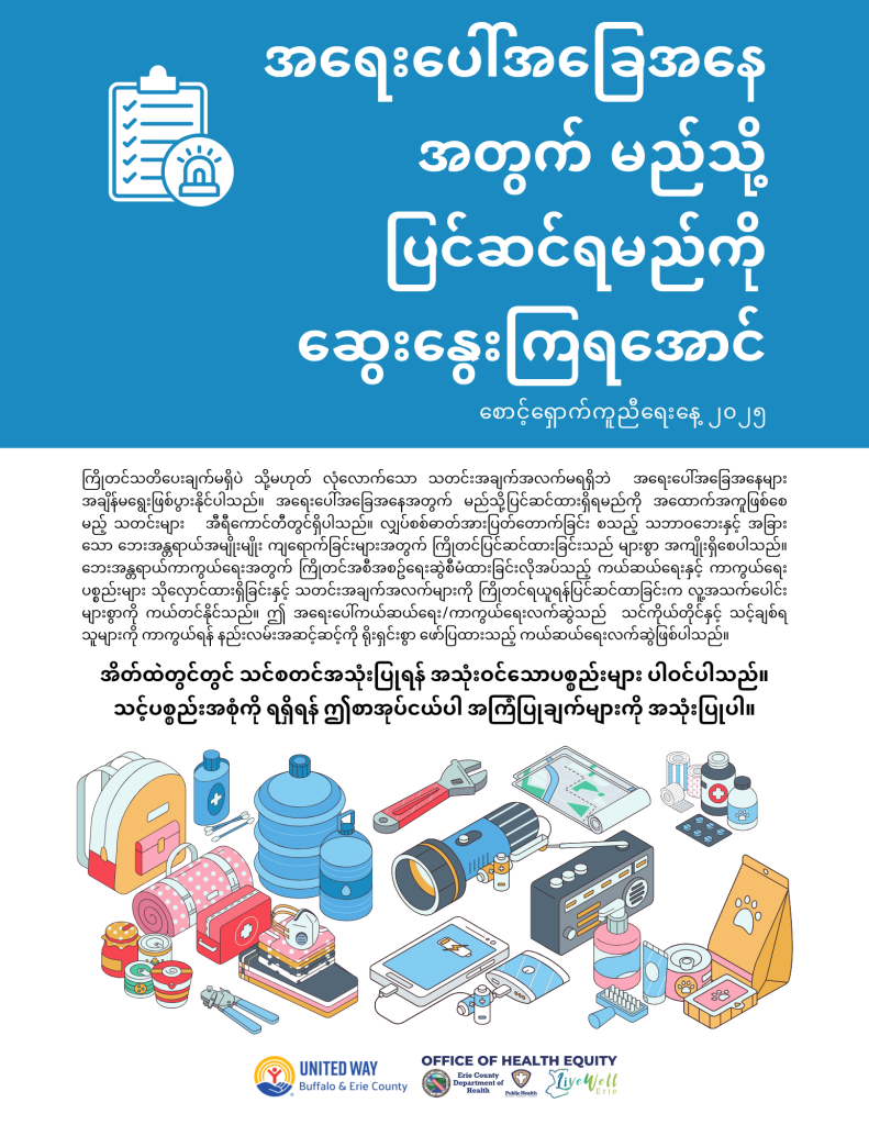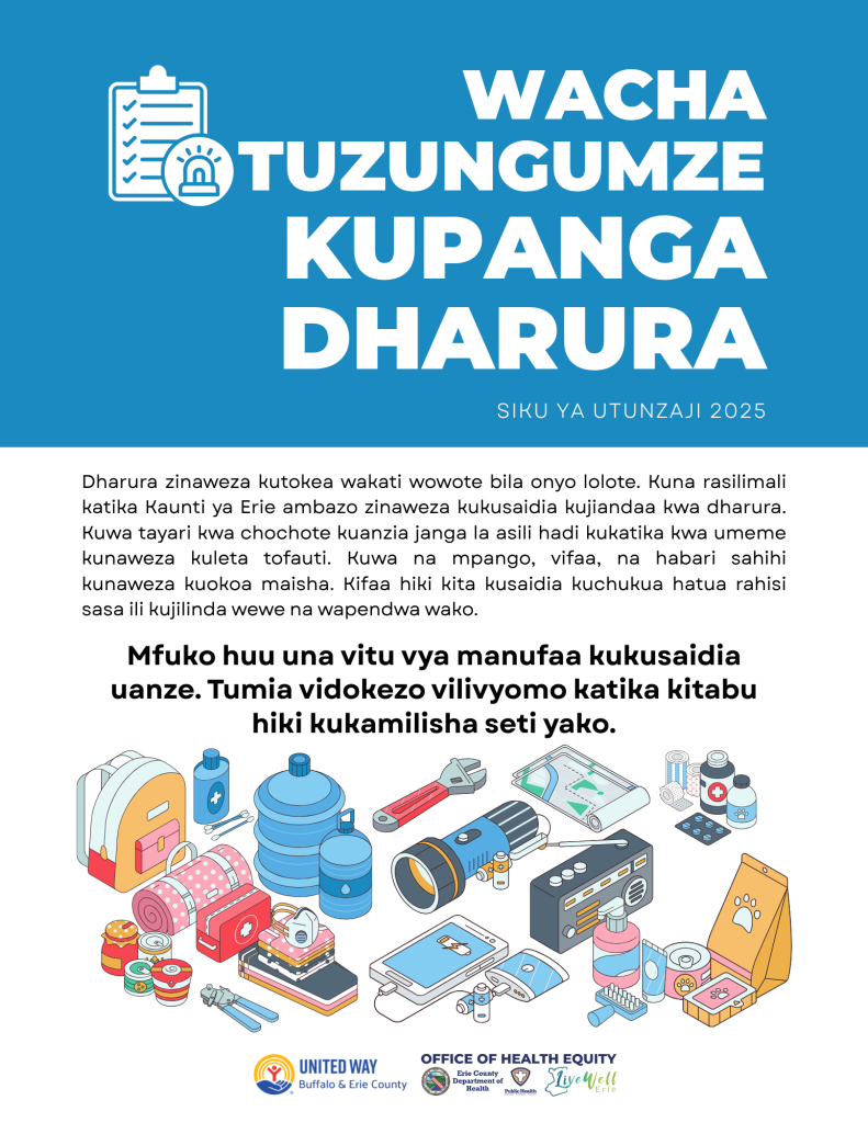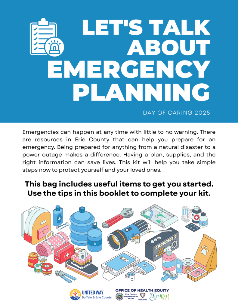 The ECOHE, in partnership with the United Way of Buffalo and Erie County, assembled and distributed emergency kits to improve emergency preparedness among Erie County residents. To ensure the emergency kits reached those who needed them most, the ECOHE worked with trusted partners within the Erie County community to distribute kits to residents. Kits were distributed throughout Erie County with a focus on distributing kits to areas that were severely impacted by the December 2022 blizzard. Kits included basic emergency preparedness supplies,such as hand crank flashlights, power banks, mylar blankets, first aid supplies, whistles, emergency food samples, Narcan, and an emergency information packet (linked below).