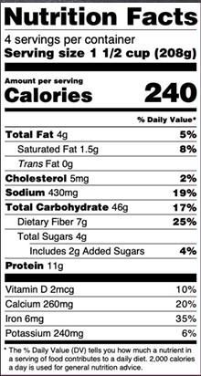 - Serving size: Does not always mean the amount you should eat! This is a simple way to measure the nutrition in the amount you did eat. For example, the sample nutrition facts label shows 1 1/2 cups as a serving size, so if you ate 3 cups, you know you need to double all of the info listed. There are four servings in the package, so if you ate the whole package, multiply everything by 4.