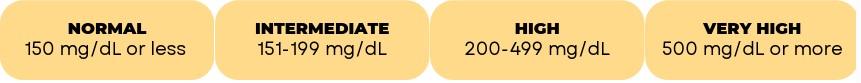 Triglycerides (after not eating food for 8-10 hours): Triglycerides are shown as a whole number with a unit of measure (mg/dL) in a cholesterol test, also called a lipid panel.