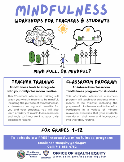 The Erie County Department of Health (ECDOH) Office of Health Equity’s mindfulness program teaches participants about the benefits of mindfulness and several activities that they can do on their own and share with others. The activities may help participants increase focus, manage pain, build healthy habits, reduce depression, reduce anxiety, manage stress and improve sleep by helping them to relax. The program is offered both in a formal setting with a PowerPoint presentation and in an informal one while tabling at health fairs.