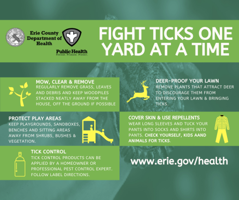 As winter cold turns to spring warmth, the Erie County Department of Health (ECDOH) wants to highlight the need to prevent tick bites and reduce the risks for tick-borne illnesses. “There are actions that you can take this spring, summer and fall to make your yard less friendly for ticks,” said Commissioner of Health Dr. Gale Burstein. “And every time you or your pets go outside, there are practical steps for you to prevent bites, check for ticks on skin and safely remove them if you have one attached.”
