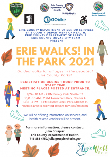 Coordinated by the Erie County Departments of Health, Senior Services, and Parks, Recreation and Forestry, and the Erie County Movability Team, these hour-long walks will tour three County parks. Health-related vendors and health education information will also be available at these events. Registration begins one hour prior to scheduled start time, and meeting places will be posted at the park entrance.