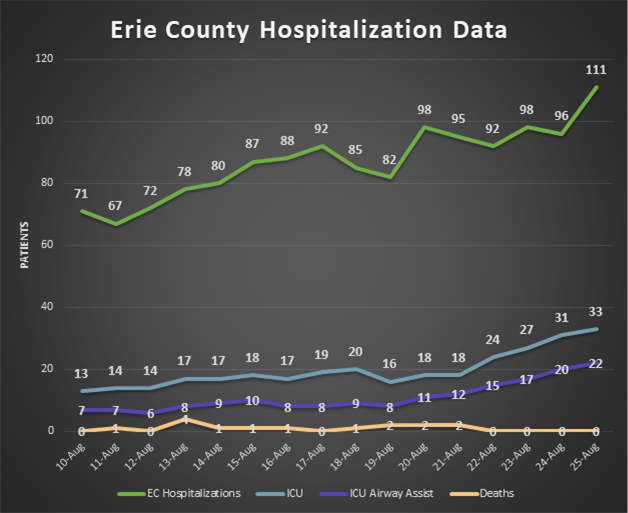 “At this time last year, Erie County was at a much better place in terms of hospitalizations and number of new daily cases, and that when we did not have access to COVID-19 vaccine,” said Commissioner of Health Dr. Gale Burstein.“On August 25, 2020, we reported 42 new COVID cases, compared to 225 new cases on August 25, 2021. Also, 24 patients were hospitalized with COVID-19 in Erie County on August 25, 2020. On August 25, 2021, Erie County hospitals had 111 patients hospitalized with COVID-19.”