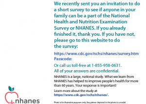 Households will be sent one or more letters inviting them to be part of NHANES by completing a brief online questionnaire to see if anyone is eligible to participate in their home. Anyone eligible will be contacted by an NHANES representative to set up a telephone health interview at a convenient time, followed by a health examination that takes place in the NHANES mobile examination center.