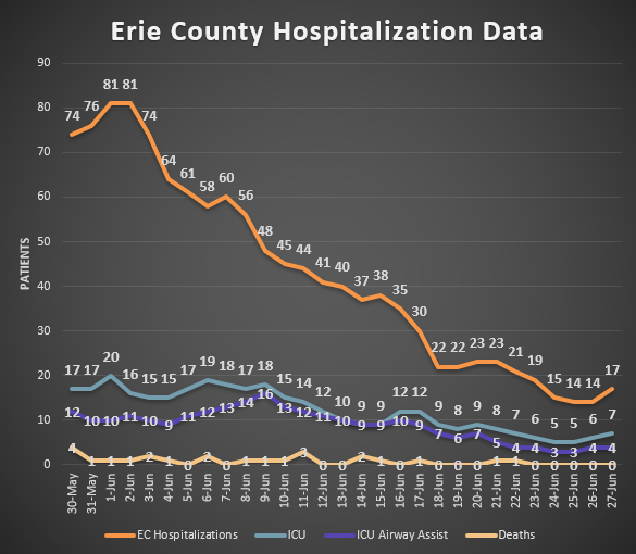 With 17 COVID-19 hospitalizations reported in Erie County for June 27, 2021, hospitalized COVID-19 patients in Erie County have declined to the lowest reported levels since these data have been tracked. [See chart at end of release].