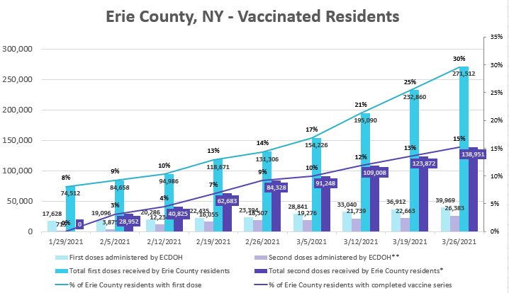 ERIE COUNTY, NY – The Erie County Department of Health (ECDOH) is providing an update on the number of COVID-19 vaccinations administered to Erie County residents based on information provided by the New York State Department of Health (NYSDOH). As of March 25, 30% of Erie County residents have received at least one dose of COVID-19 vaccine, while 15% percent have completed the COVID-19 vaccine series.