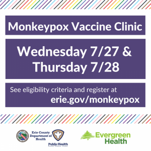 ERIE COUNTY – The Erie County Department of Health (ECDOH) and Evergreen Health are coordinating a two-day monkeypox vaccine clinic on Wednesday, July 27 and Thursday, July 28. These clinics will vaccinate Erie County residents at highest risk of monkeypox infection.