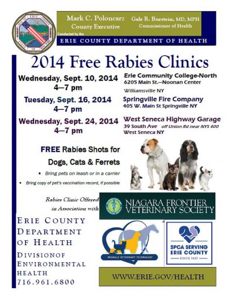 ERIE COUNTY, NY— The Erie County Department of Health (“ECDOH”), in collaboration with the Niagara Frontier Veterinary Society, the Medaille College Veterinary Technology program and the SPCA serving Erie County, is holding three free Rabies Vaccination clinics throughout the County in September. Residents are strongly encouraged to take advantage of this opportunity to ensure the health and safety of their pet dogs, cats and ferrets. New York State law requires rabies vaccinations for all cats, dogs and domesticated ferrets no later than four months after its date of birth.