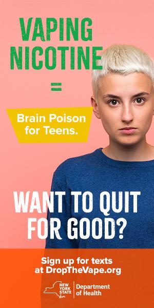 NY State Smokers’ Quitline or call 1-866-NY-QUITS (1-866-697-8487) or send a text to 716-309-4422 for smoking cessation supplies and tips.