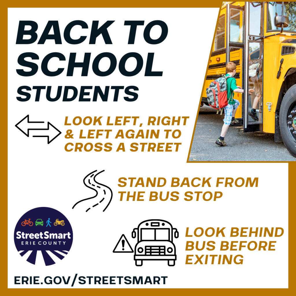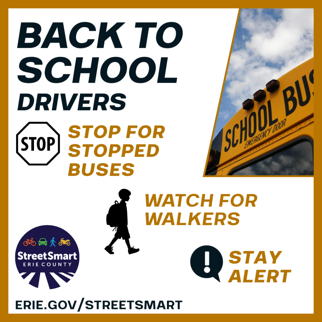 Back to School: Attention, Drivers! Students are back in school and school buses are back on the road. Drivers – please remember to: Stop for all stopped school buses Watch out for walkers, especially near schools Be alert, especially near school zones, bus stops, and during drop-off/dismissal. The New York State Traffic Safety Committee has more details on sharing the road with school buses and students. https://trafficsafety.ny.gov/school-bus-safety #StreetSmartErie #BackToSchool #ThisIsPublicHealth #SafeStreets #RoadSafety #DriveSmart |