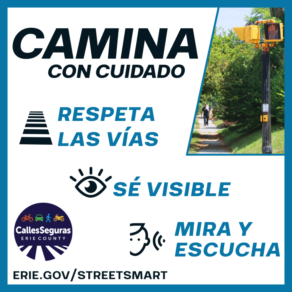 CAMINA CON CUIDADO Ya sea que camines a la escuela, al trabajo o por tu vecindario, la seguridad comienza con pasos simples. Respeta las vías– Cruza en los pasos de peatones marcados, camina en las aceras y mantén las vías peatonales libres de nieve y escombros. Sé visible – Usa ropa brillante o reflectante después del anochecer. No envíes mensajes de texto mientras caminas cerca del tráfico. Haz contacto visual con los conductores para asegurarte de que te vean. Mira y escucha – Mira en ambas direcciones antes de cruzar. Evita usar audífonos. Aprende más en Erie.gov/streetsmart #StreetSmartErie #EstoEsSaludPública #CallesSegurasErie #SeguridadVial #CaminaConCuidado |