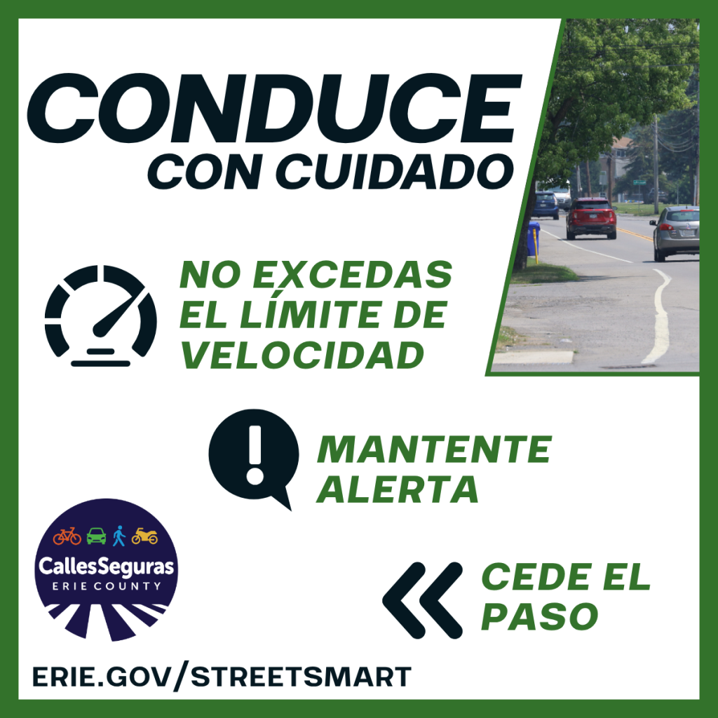 CONDUCE CON CUIDADO Conducir con cuidado protege a todos en la vía, desde otros conductores hasta peatones y ciclistas. Respeta el límite de velocidad – Un peatón atropellado a 20 mph tiene un 90% de probabilidad de sobrevivir. A 30 mph, esa probabilidad baja a menos del 50%. Cede el paso – Al acercarte a zonas de trabajo o vehículos de emergencia, reduce la velocidad y cede el paso si es posible. Mantente alerta – Es más difícil ver a los niños. Presta mucha atención en vecindarios y cerca de las escuelas. Siempre detente cuando haya un autobús escolar. Aprende más en Erie.gov/streetsmart #StreetSmartErie #CallesSegurasErie #EstoEsSaludPública #SeguridadVial #ConduceConCuidado |