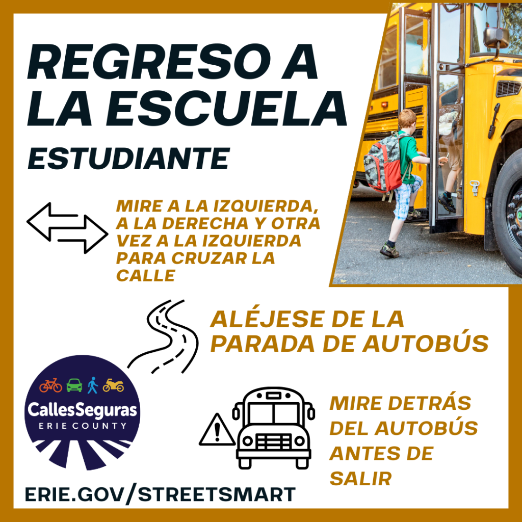 Regreso a la escuela: ¡Atención, estudiantes! ¡Bienvenidos de nuevo a la escuela! Asegúrense de que ustedes y sus amigos lleguen a casa seguramente. Por favor recuerden siempre: Antes de cruzar, miren a la izquierda, a la derecha y otra vez a la izquierda para ver si vienen vehículos. Cuando esperen al autobús, manténganse alejados de la parada y de la calle. Al bajar del autobús, miren hacia atrás (a su derecha). Algunos conductores no respetan la seguridad del autobús y podrían intentar adelantarse. El Comité de Seguridad Vial del Gobernador tiene más detalles sobre cómo compartir la carretera con autobuses escolares y estudiantes. https://trafficsafety.ny.gov/school-bus-safety #StreetSmartErie #CallesSegurasErie #EstoEsSaludPública #RegresoALaEscuela #CamineConCuidado |