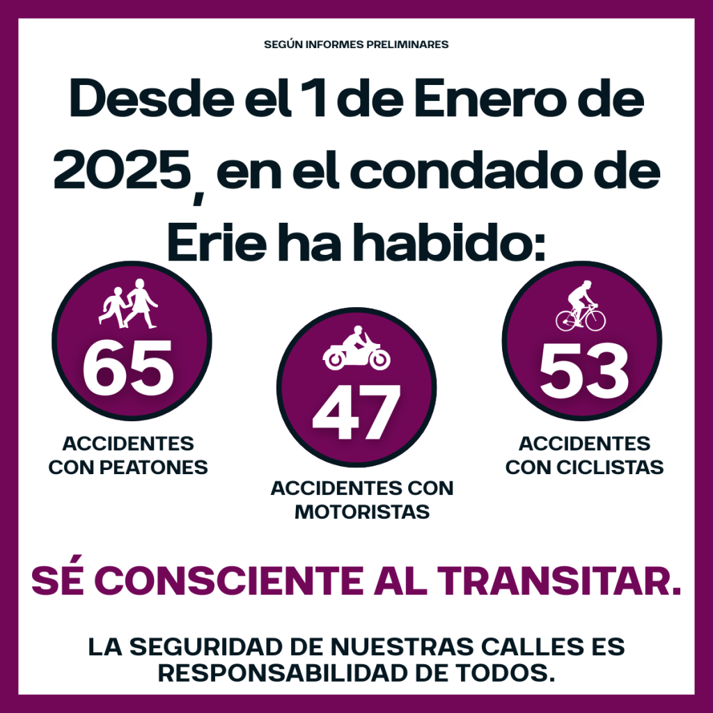 La seguridad de nuestras calles es responsabilidad de todos. Según informes preliminares, del 1 de enero al 22 de julio de 2025, en el condado de Erie ha habido 65 accidentes que involucraron a peatones, 47 a motociclistas y 53 a ciclistas. Estas cifras son una clara llamada a la acción. Sé consciente al transitar. Ayuda a prevenir accidentes y proteger vidas. Visita erie.gov/streetsmart para más información. #StreetSmartErie #SeguridadVial #CallesSegurasErie #EstoEsSaludPública |
