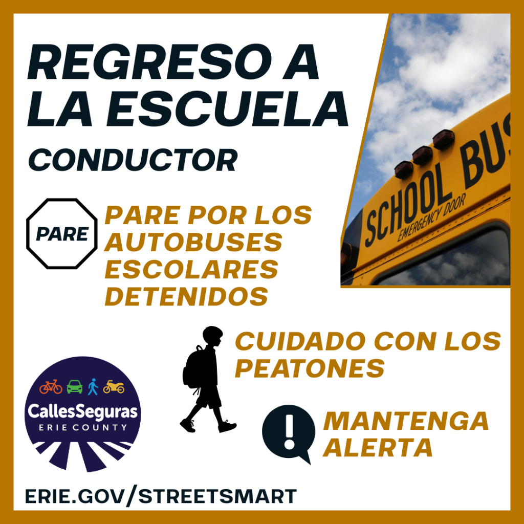 Regreso a la escuela: ¡Atención,conductores! Los estudiantes han vuelto a la escuela y los autobuses escolares han regresado a las calles. Conductores, por favor recuerden siempre: Parar por autobuses escolares que estén detenidos. Tener cuidado con los peatones, especialmente cerca de las escuelas. pe Mantenerse alerta, especialmente en zonas escolares, paradas de autobús y durante la llegada y salida de los estudiantes. El Comité de Seguridad Vial del Gobernador tiene más detalles sobre cómo compartir la carretera con autobuses escolares y estudiantes. https://trafficsafety.ny.gov/school-bus-safety #StreetSmartErie #CallesSegurasErie #EstoEsSaludPública #RegresoALaEscuela #ConduceConCuidado |