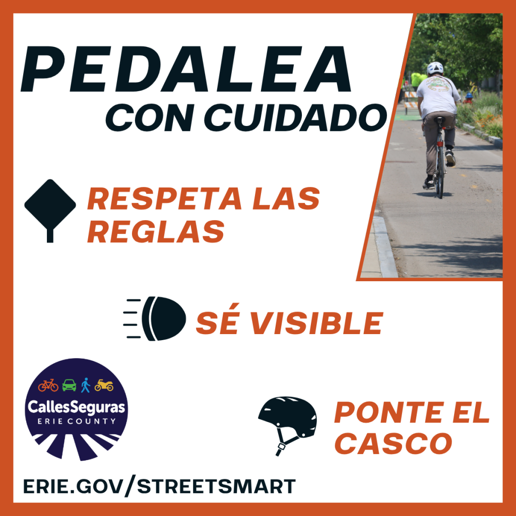 PEDALEA CON CUIDADO Ya sea que andes en bicicleta por diversión, ejercicio o transporte, la seguridad debe ser parte de cada paseo. Ponte el casco – Los cascos reducen el riesgo de lesiones en la cabeza hasta un 85%. Sigue las reglas – Circula en la dirección del tráfico, obedece todas las señales de tráfico y usa señales manuales para indicar el doblar y el parar. Sé visible – Usa ropa clara o reflectante, especialmente de noche. Cuando sea posible, mantente en los carriles designados para bicicletas y fuera de la acera. Aprende más en Erie.gov/streetsmart #StreetSmartErie #EstoEsSaludPública #CallesSegurasErie #SeguridadVial #PedaleaConCuidado |