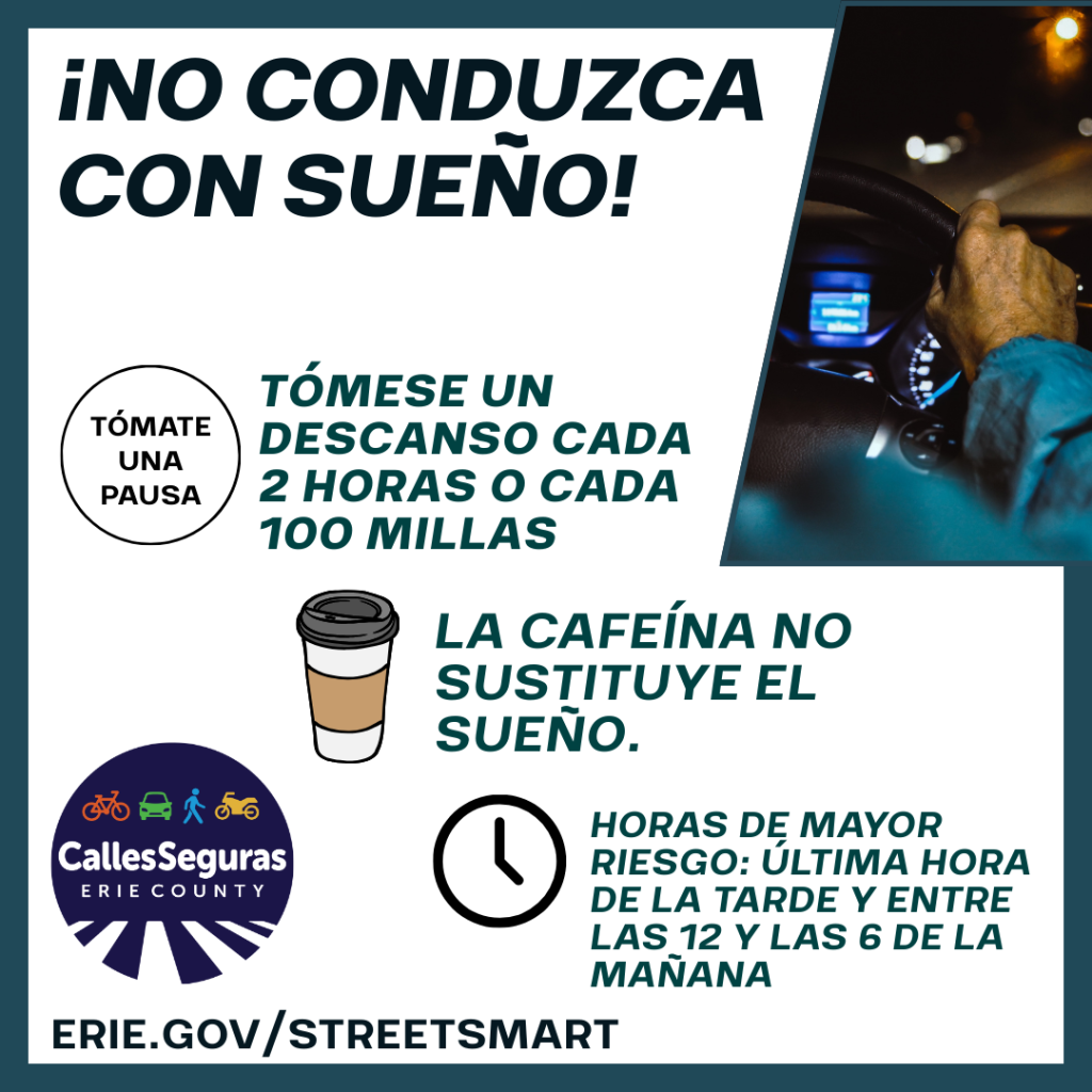 ¡No conduzca con sueño! Conducir cuando tiene sueño o está muy cansado reduce su tiempo de reacción y aumenta el riesgo de sufrir un accidente que podría causar lesiones graves o incluso la muerte. No se convierta en una estadística por manejar con sueño. Tómese un descanso cada 2 horas o cada 100 millas. La cafeína no sustituye el sueño. Las horas de mayor riesgo para manejar con sueño son en la tarde y entre la medianoche y las 6 de la mañana. La administración Nacional de Seguridad del Tráfico en las Carreteras (NHTSA) tiene más detalles: https://www.nhtsa.gov/es/conducir-de-forma-riesgosa/manejar-sonoliento #StreetSmartErie #CallesSegurasErie #EstoEsSaludPública #NoConduzcaConSueño |