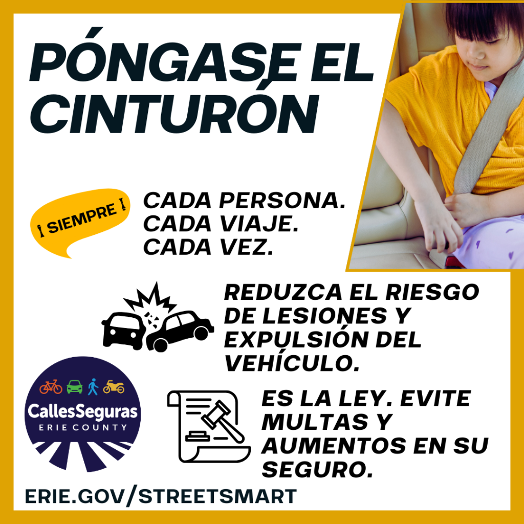 Conductores y pasajeros deben usar el cinturón en cada viaje, cada vez. Los cinturones de seguridad reducen el riesgo de lesiones graves y pueden evitar la expulsión del vehículo. Solo toma unos segundos abrochárselo y puede ayudarle a viajar más seguramente. ¡Conviértalo en un hábito! #StreetSmartErie #CallesSegurasErie #EstoEsSaludPública #PóngaseElCinturón |
