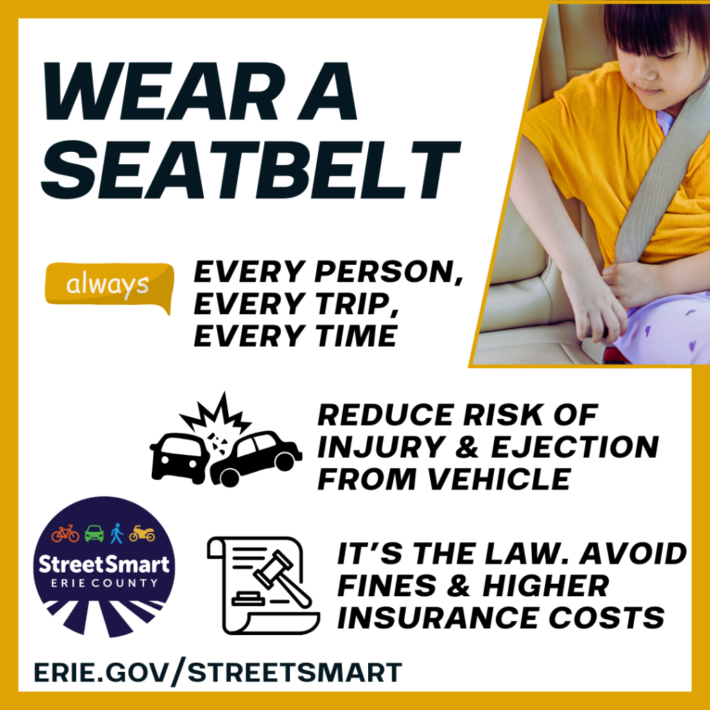 Drivers and passengers must wear a seatbelt – every trip, every time. Seatbelts reduce the risk of serious injury and can prevent ejection from the vehicle. It only takes a second or two to make sure you’re as safe as possible during your drive. Make it a habit! Erie.gov/streetsmart #StreetSmartErie #ThisIsPublicHealth #SafeStreets #RoadSafety #WearASeatbelt |