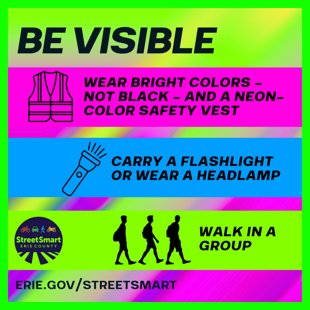 Whether you're walking, biking or riding a scooter, make sure drivers can see you—stay visible to stay safe! 👕 Wear bright or reflective clothing. Neon green or “safety orange” vests are a great option! They’re lightweight, affordable, and often come with useful pockets. 🔦 Use a flashlight or headlamp if you're walking or biking at dawn, dusk, or night. It helps you see—and be seen. 🚶♀️🚶♂️ Walk in a group when possible. A group is more noticeable to drivers than a single person. Erie.gov/streetsmart #StreetSmartErie #ThisIsPublicHealth #SafeStreets #RoadSafety #BeVisible |