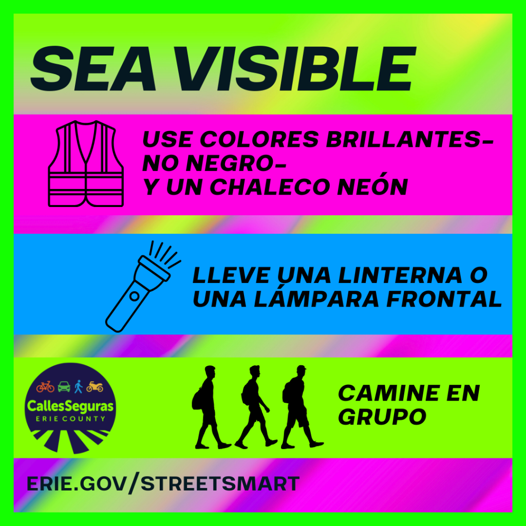 🚶♀️🚴♂️🛴Si camina, anda en bicicleta o usa un scooter, asegúrese de ser visible para conductores. ¡Mantenerse visible es mantenerse seguro! 👕 Use ropa brillante o reflectante. 🔦 Lleve una linterna o use una lámpara frontal si camina o anda en bicicleta al amanecer, al anochecer o de noche. Le ayuda a ver y a que lo vean. 🚶♀️🚶♂️ Camine en grupo cuando sea posible. #StreetSmartErie #CallesSegurasErie #EstoEsSaludPública #SeaVisible #CamineConCuidado |