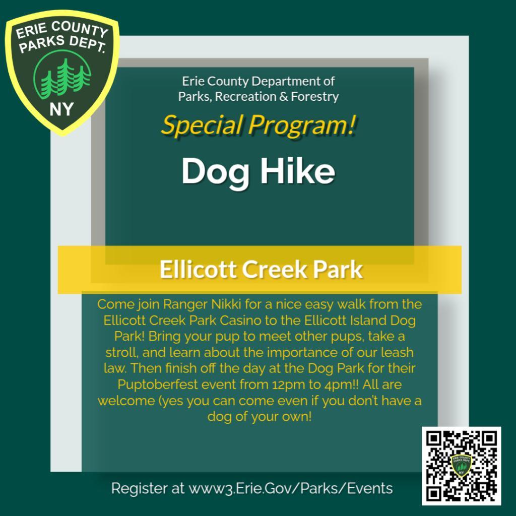Come join Ranger Nikki for a nice easy walk from the Ellicott Creek Park Casino to the Ellicott Island Dog Park! Bring your pup to meet other pups, take a stroll, and learn about the importance of our leash law. Then finish off the day at the Dog Park for their Puptoberfest event from 12pm to 4pm!! All are welcome (yes you can come even if you don’t have a dog of your own!)