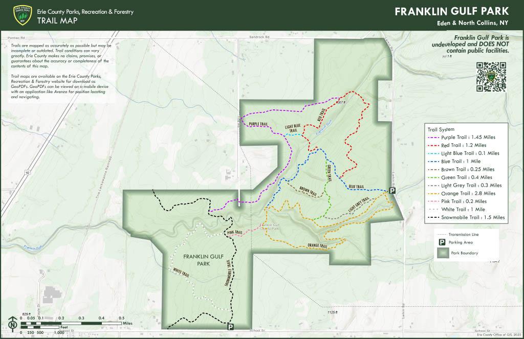 Franklin Gulf Park is formerly known as Larkin Woods. It is a 631-acre undeveloped park that is bounded by Sandrock Road to the north, Larkin Road to the east and School Street to the south. The park is primarily a wooded area with creeks, ravines, waterfalls and ledge outcroppings. There is a parking area on Larkin Road, just before the North Collins Town Line.