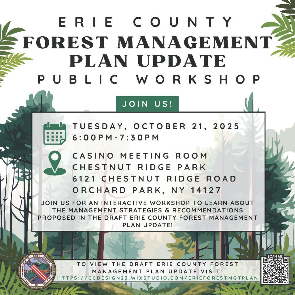 Erie County is nearing the end of the planning process to update the Forest Management Plan and is seeking your feedback! Please join us Tuesday, October 21, 2025 from 6:00 pm - 7:30 pm at the Chestnut Ridge Casino Meeting Room (6121 Chestnut Ridge Road, Orchard Park, NY) for a public workshop to discuss the draft Plan. The intent of the workshop is to receive feedback, educate and inform regarding various forest management practices being proposed, and obtain input.