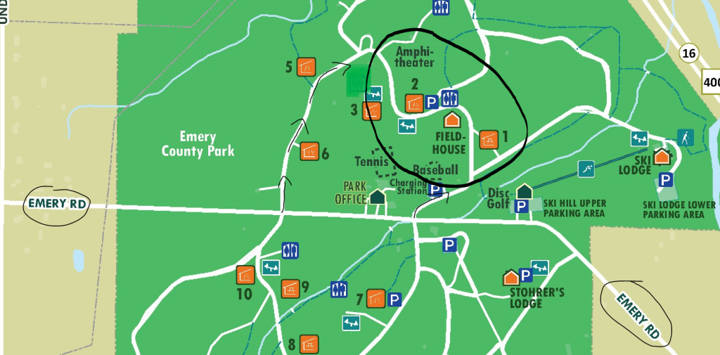 Note about the Weather: This event is rain or shine. If there is rain predicted, the workshops will be shifted inside the field house and vendors and activities will be sheltered. See the map below showing the location of the amphitheater and the fieldhouse in the northern part of Emery Park. There will be signs as well.