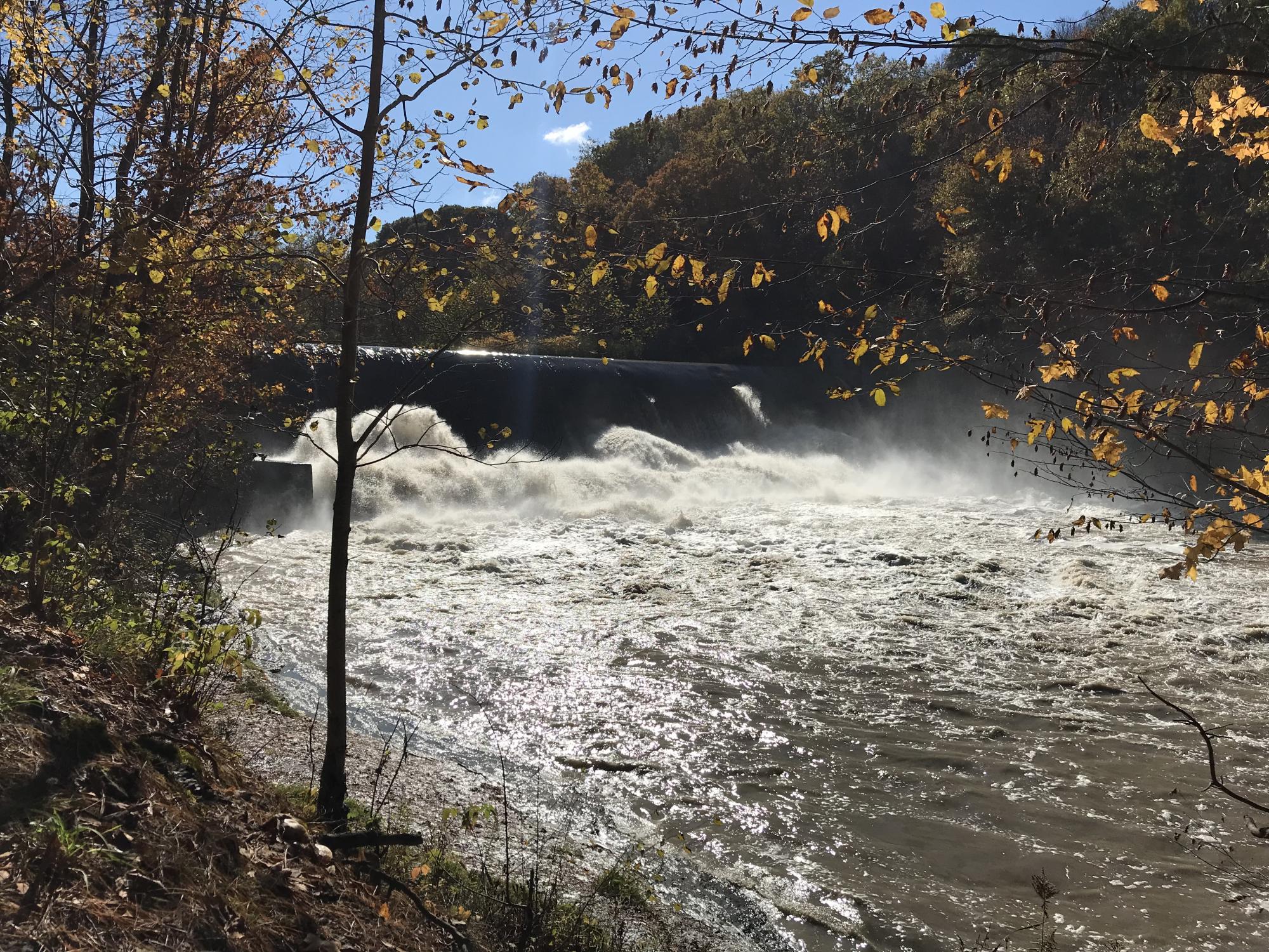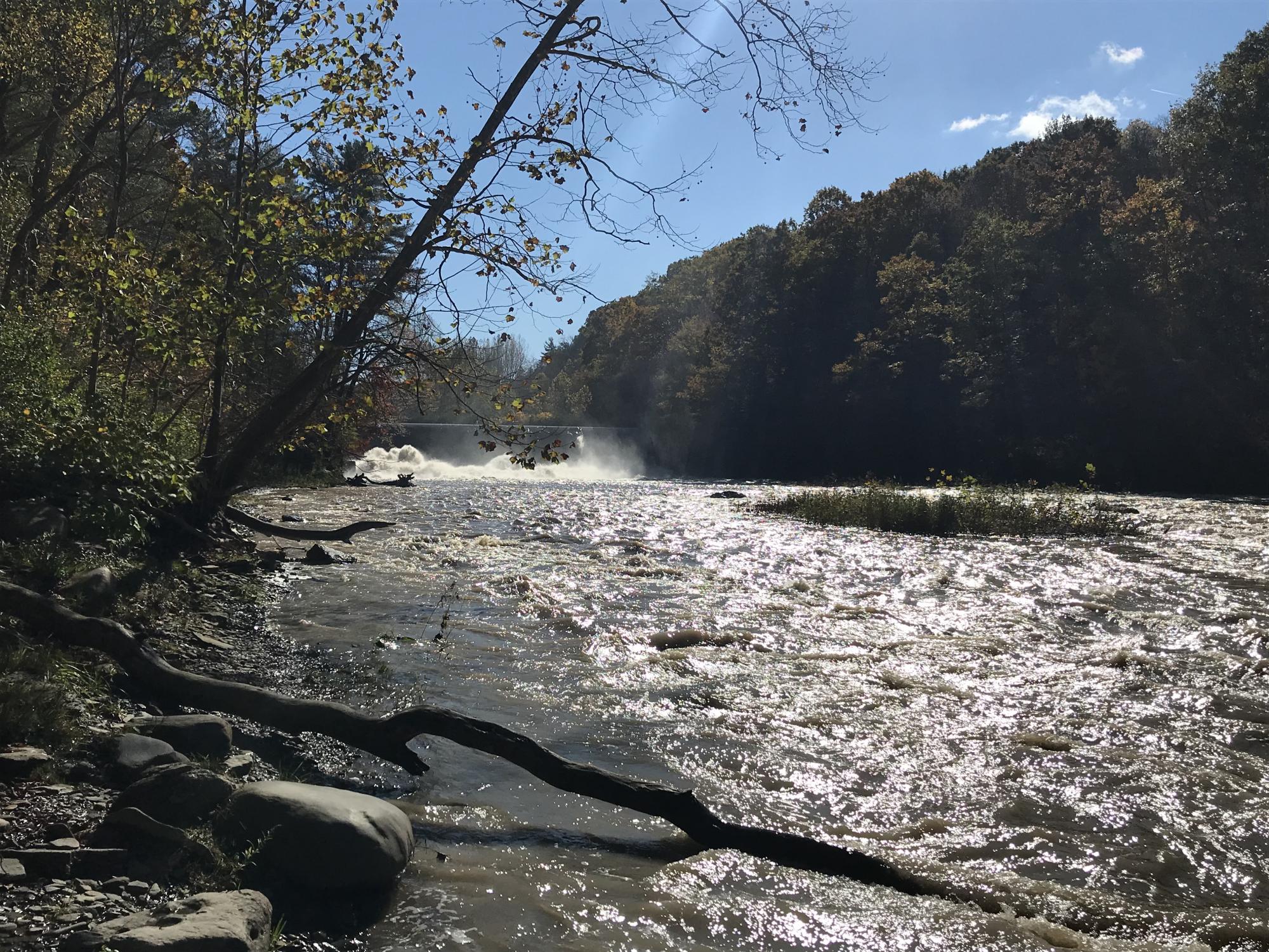 Scoby Dam Park is a linear strip of land along Cattaraugus Creek and is a mecca for fishing. The passive park takes advantage of its superb siting on the Creek, including fishing, informal kayak access, hiking and the beautiful scenery at the southern end of Erie County. Scoby Hill Dam is the site of a small turn-of-the-century hydroelectric generating facility on Cattaraugus Creek, and at one time generated a small percentage of the Village of Springville’s electricity. The dam was constructed in 1924 and is 30-feet high. The existing building is in very good condition, it and the Dam are listed on the National Register of Historic Places. The site affords scenic views of the creek and dam. Currently, Scoby Hill Road ends at Cattaraugus Creek near the dam. The bridge, which formerly carried Scoby Hill Road across Cattaraugus Creek, was removed after the 1998 summer flooding and there are no plans to rebuild it. The creek bank suffered a great deal of erosion in the June 1998 storm. The Army Corps of Engineers is currently developing a plan to open the access upstream to various fish populations that will make this area a primary fishing destination in Erie County. A rest stop along Cascade Road is maintained by the County. It contains a small picnic shelter and a large area of maintained turf.