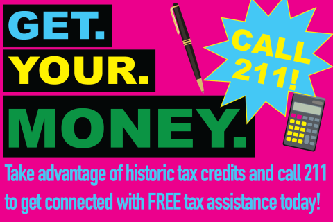 Those interested in applying for historic tax (Earned Income Tax) credits {EITCs} as part of the tax filing process can call 2-1-1 for free-of-charge assistance!